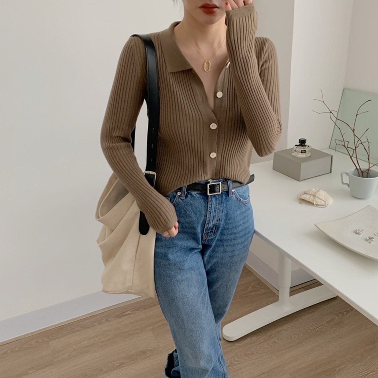 (7色選択可) トップス ニット カーディガン ショート丈 襟付き ポロ襟 シングルブレスト ボタン 長袖 シンプル カジュアル きれいめ 大人可愛い おしゃれ かわいい 大人カジュアル お洒落 こなれ感 大人女子 フリーサイズ 10代 20代 30代 40代 普段使い デイリー 通勤 休日 お出かけ デート 女子会 着回し コーデ 韓国系 ファッション 秋 冬 無地 カラバリ オレンジ ホワイト 白 パープル 紫 ブルー 青 キャメル 茶色 ブラック 黒 マスタードグリーン 緑 | Chère