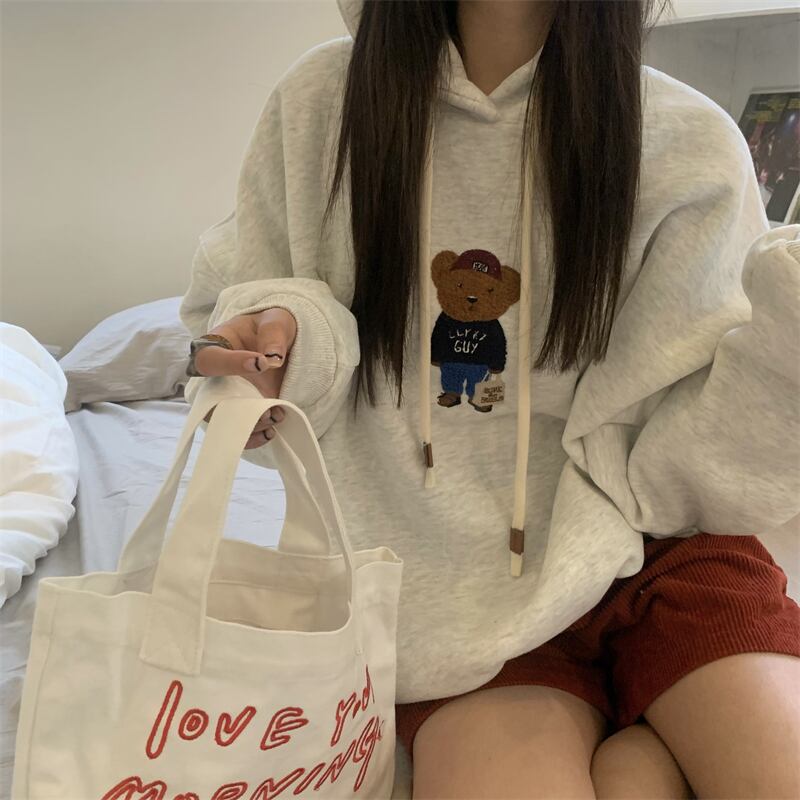テディベア刺繍が可愛いカジュアルな大人可愛いプルオーバーパーカー。