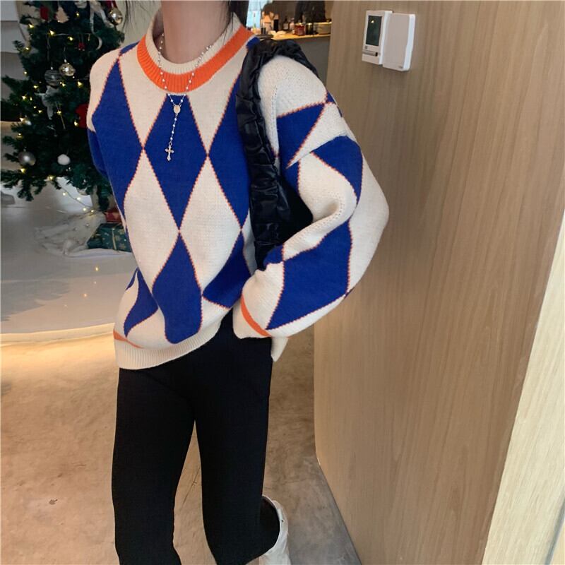 大きなバイカラーダイヤ柄とラインがレトロなニットプルオーバーです。