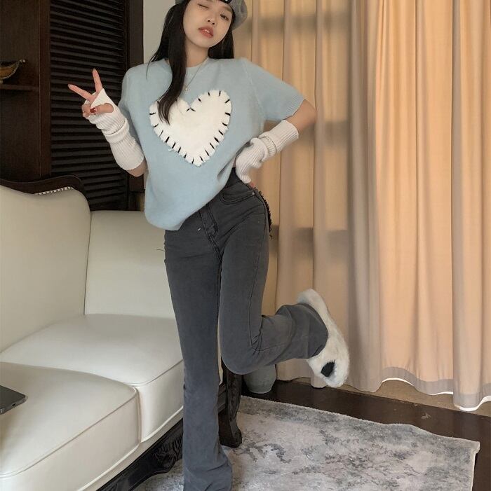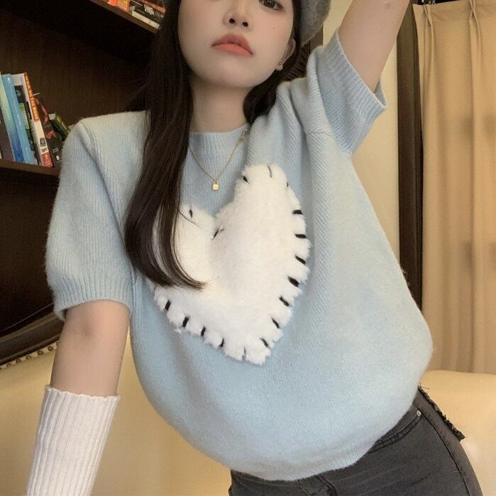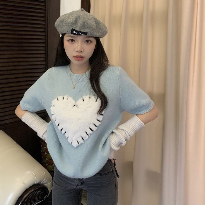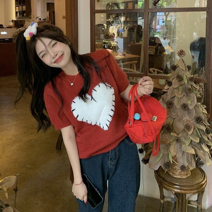 (3色選択可) トップス プルオーバー ニット セーター ハート キュート 半袖 ラウンドネック 韓国 スタイル パステルカラー かわいい 大人可愛い シンプル お洒落 レトロ ラフ ラブリー ガーリー 個性的 着回し 普段使い お揃い 双子 楽ちん あったか ギフト 学生 デート お出かけ 公園デビュー 休日 アウトドア イベント レディース 母の日 ハロウィン クリスマス バレンタイン 赤 レッド 青 ブルー オフホワイト フリーサイズ ゆる 部屋着 寝巻き ルームウェア ラブ 萌え ステッチ | Chère