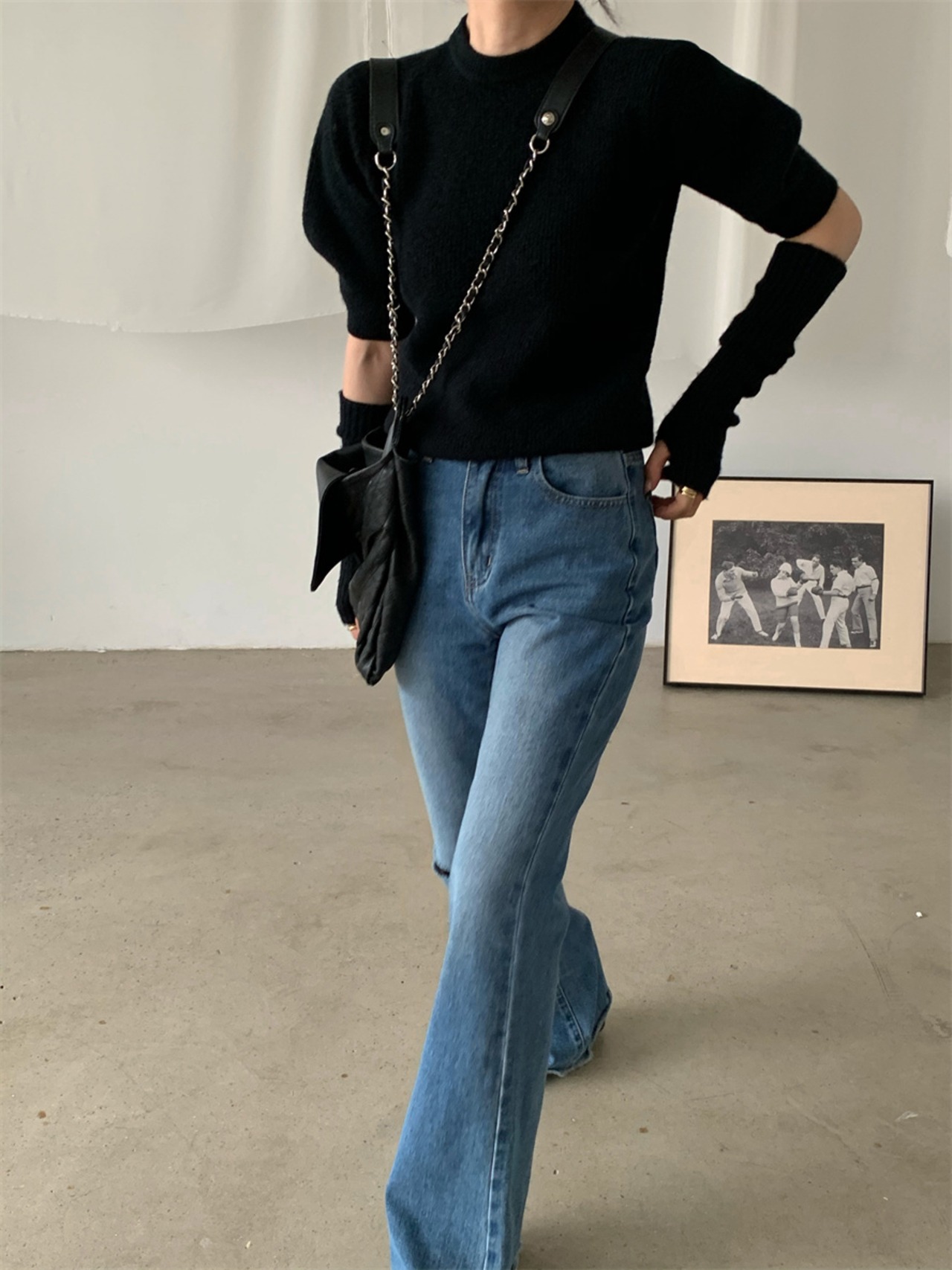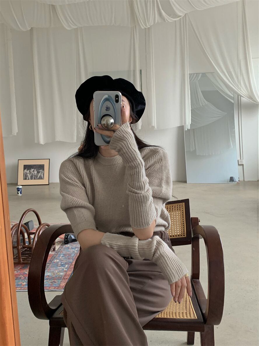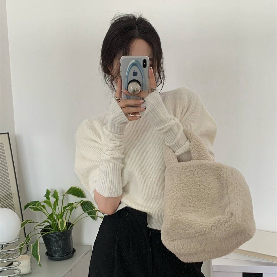 フェミニンなパフスリーブにアームカバー付きの大人可愛いニットセーター。