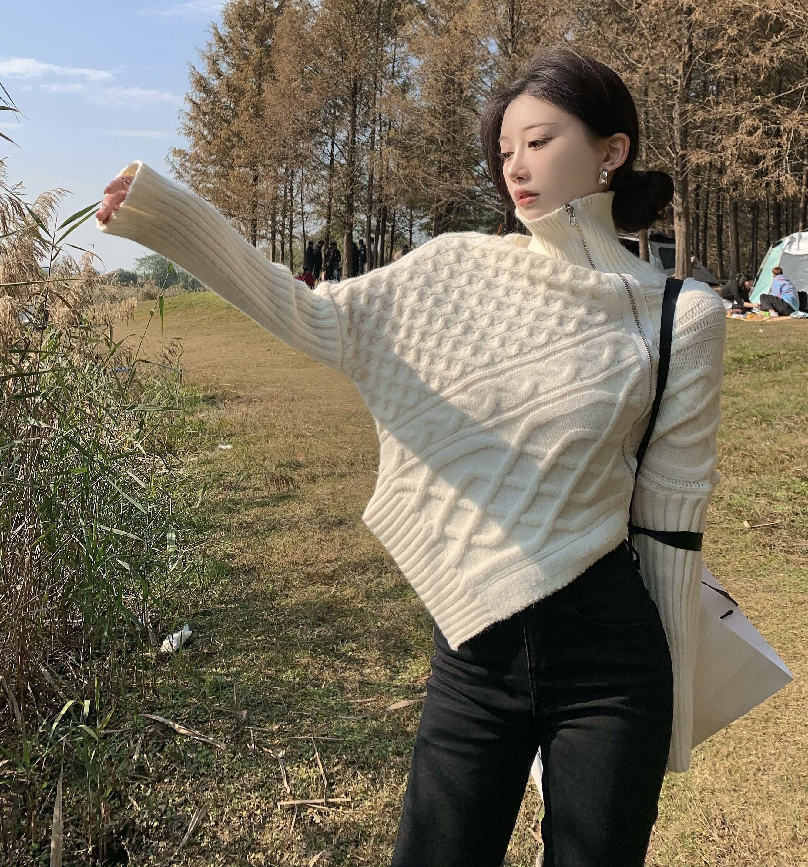 (2色選択可) トップス ニット セーター ジップ ジッパー ハイネック スタンドカラー 長袖 ケーブル編み モード アシンメトリー シンプル カジュアル こなれ感 ルーズ かわいい おしゃれ ボーイッシュ 10代 20代 30代 40代 通勤 通学 普段使い 休日 デート お出かけ 女子会 韓国系 ファッション コーデ 無地 ブラック 黒 ホワイト 白 | Chère