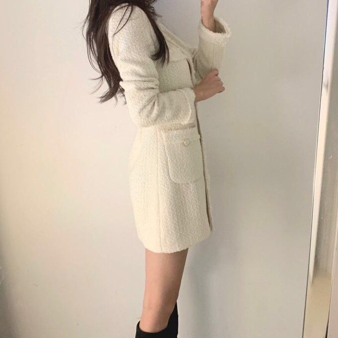(色とサイズが選択可) ワンピース ワンピースドレス ツイード ミニ丈 ミニワンピース 長袖 ホワイト ブラック 黒 S M L フロントボタン クルーネック ポケット 10代 20代 30代 40代 レディース オフィス OL 通勤 デート お出かけ 女子会 パーティー イベント 着回し 普段使い スタイル モテ 美脚 脚長 春 夏 秋 冬 オールシーズン 成人式 入学式 入園式 結婚式 二次会 ハロウィン クリスマス 無地 大人可愛い きれいめ シンプル 上品 おしゃれ お洒落 こなれ感 エレガント | Chère