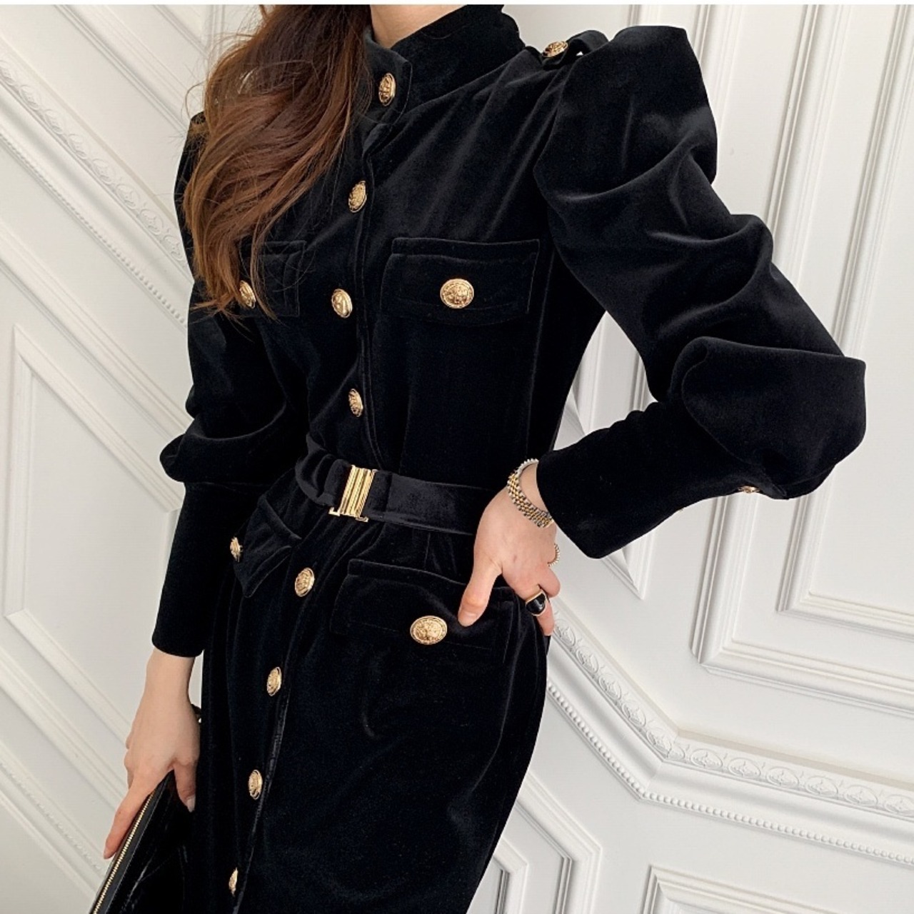 ワンピース ワンピースドレス ウエストマーク 黒 ブラック ロング ロング丈 長袖 スリット フロントボタン スタンドカラー フリーサイズ スリム 細身 パフスリーブ ペンシルスカート 大人可愛い きれいめ シンプル 大人 上品 おしゃれ お洒落 かっこいい レトロ 大人女子 こなれ感 ラブリー 個性的 クール モード系 エレガント モダン 主役級 フリーサイズ 大きめ ゆる 無地 10代 20代 30代 40代 レディース オフィス デート お出かけ 女子会 パーティー イベント 旅行