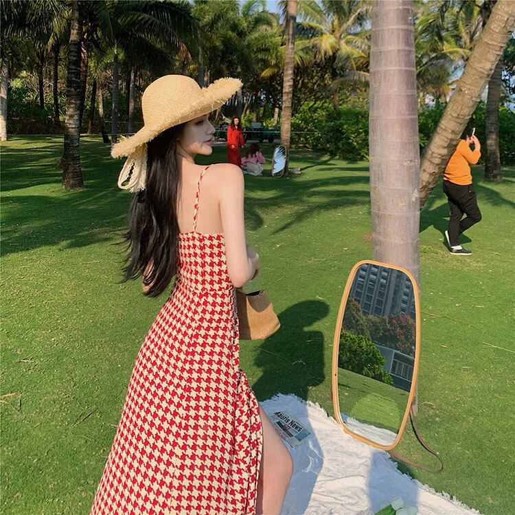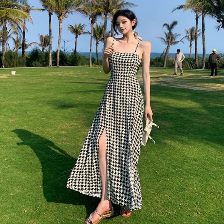(色とサイズが選択可) ワンピース ロングワンピース ノースリーブ ハイウエスト Aライン スリット カジュアル ロング丈 千鳥格子柄 チェック柄 かわいい レトロ おしゃれ 大人カジュアル 大人女子 お洒落 大人可愛い S M L XL 10代 20代 30代 40代 休日 お出かけ デート 女子会 海 旅行 インスタ映え モテ コーデ 体型カバー スタイルアップ 韓国系 ファッション ブラック 黒 レッド 赤 | Chère