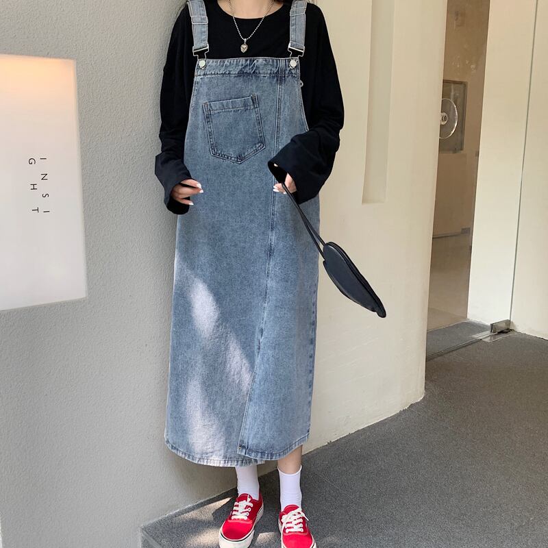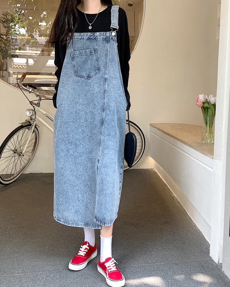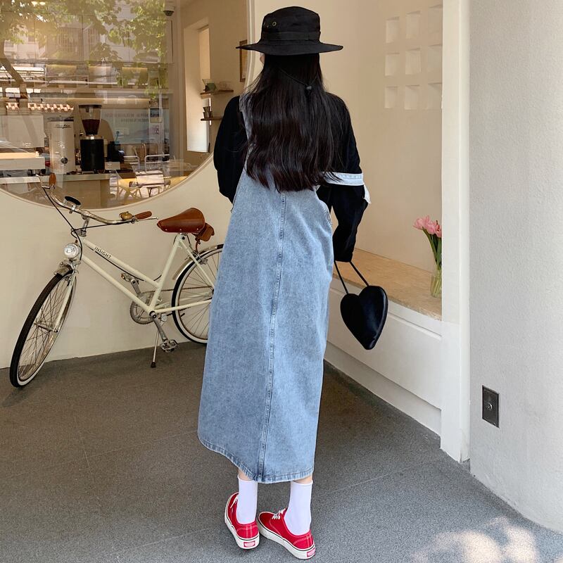 (色とサイズが選択可) ワンピース サスペンダースカート デニム ロング丈 Aライン スリット ハイウエスト ノースリーブ ラウンドネック ポケット シンプル カジュアル ストリート系 かわいい こなれ感 キュート 大人女子 大人可愛い おしゃれ 大人カジュアル お洒落 S M L 10代 20代 30代 40代 学生 ママ 休日 お出かけ デート 女子会 普段使い 着回し モテ コーデ インスタ映え 体型カバー 韓国系 ファッション 韓国 ライトブルー ダークブルー 青 紺 無地 | Chère