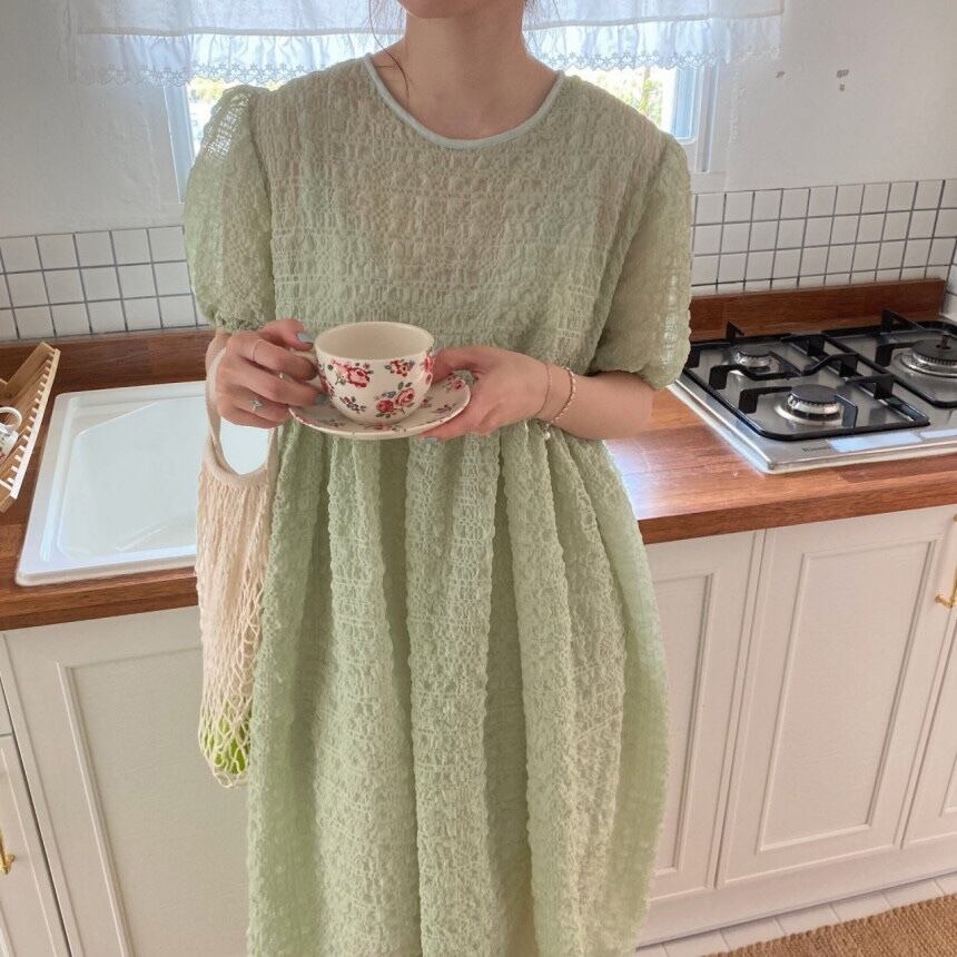 (3色選択可) ワンピース ロングワンピース Aライン 裏地付き ペチコート付き ブラック アプリコット グリーン フレア ミモレ丈 ラウンドネック チェック ちりめん 半袖 パフスリーブ ウエストゴム ゆったり 体型カバー レディース 可愛い きれいめ シンプル カジュアル 大人 かわいい おしゃれ お洒落 上品 エレガント 大人可愛い 大人女子 春 夏 10代 20代 30代 40代 デート お出かけ 女子会 デイリー 普段着 通勤 OL オフィス パーティー