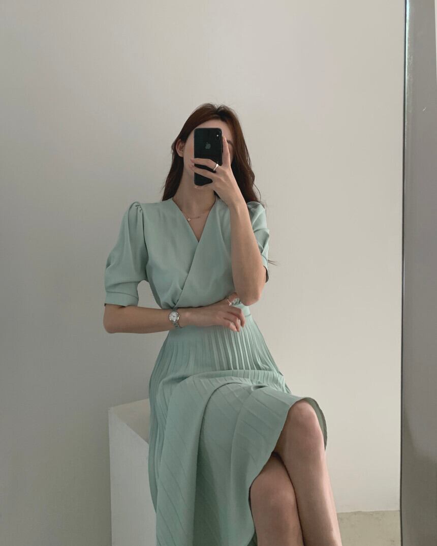 ペールトーンが上品でフェミニンムードのプリーツワンピースです。
