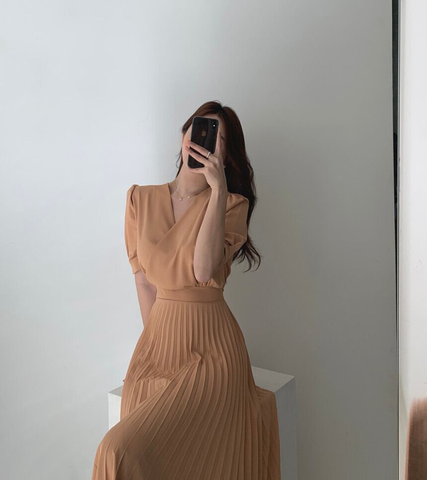 ざっくりVネックのカシュクールデザインがセクシーで、プリーツがガーリーな一着です。