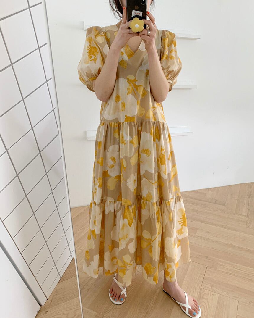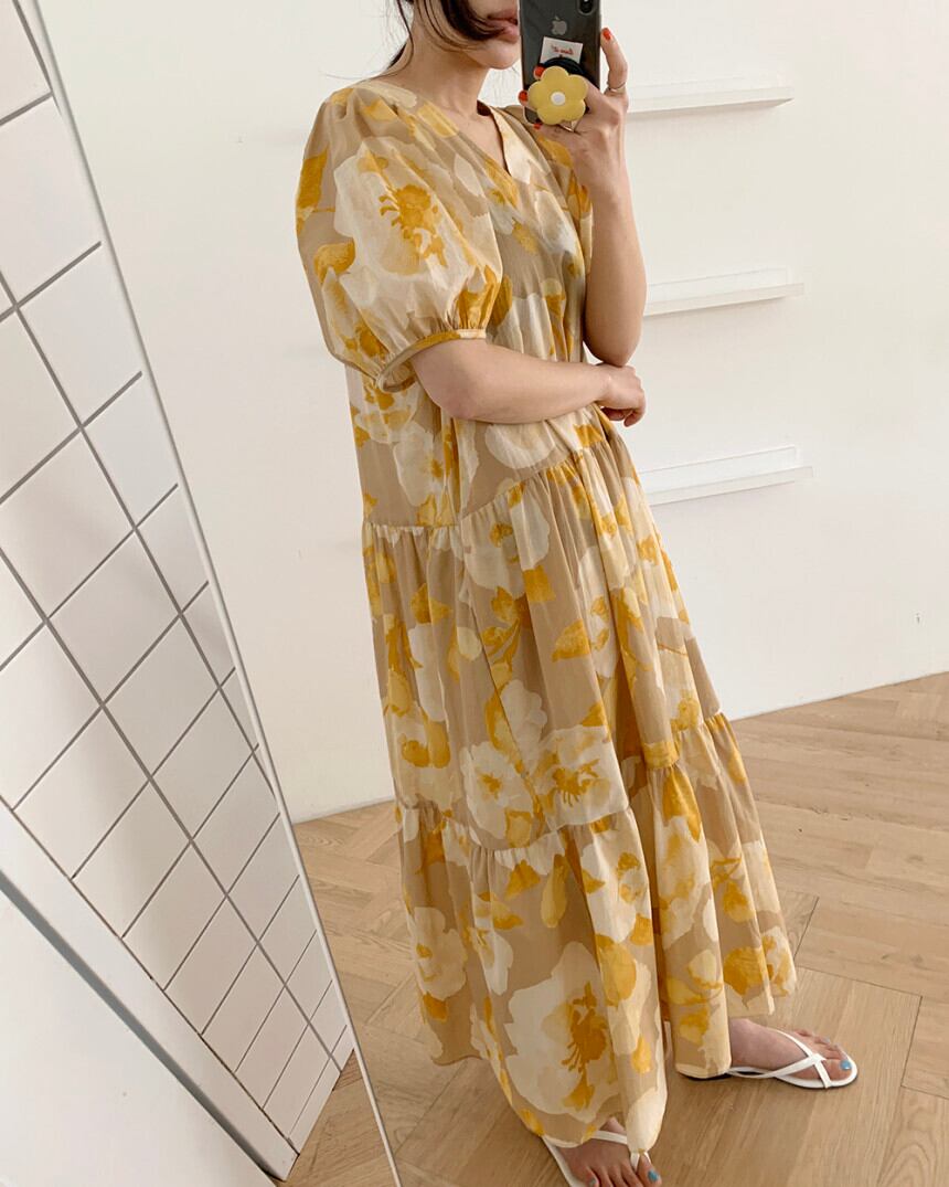 (2色選択可) ワンピース ロングワンピース ティアードワンピ Aライン イエロー ピンク フレアワンピ 大花柄 フラワー フローラル ロング丈 Vネック 半袖 レトロ カジュアル パフスリーブ ウエストギャザー ゆったり 体型カバー レディース 可愛い きれいめ シンプル 大人 かわいい おしゃれ お洒落 上品 エレガント 大人可愛い 大人女子 春 夏 10代 20代 30代 40代 デート お出かけ 女子会 デイリー 普段着 通勤 OL オフィス パーティー | Chère