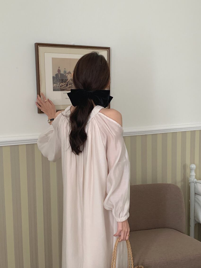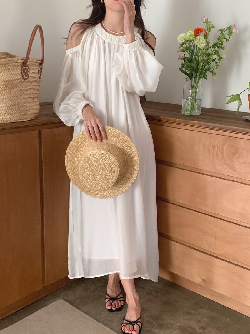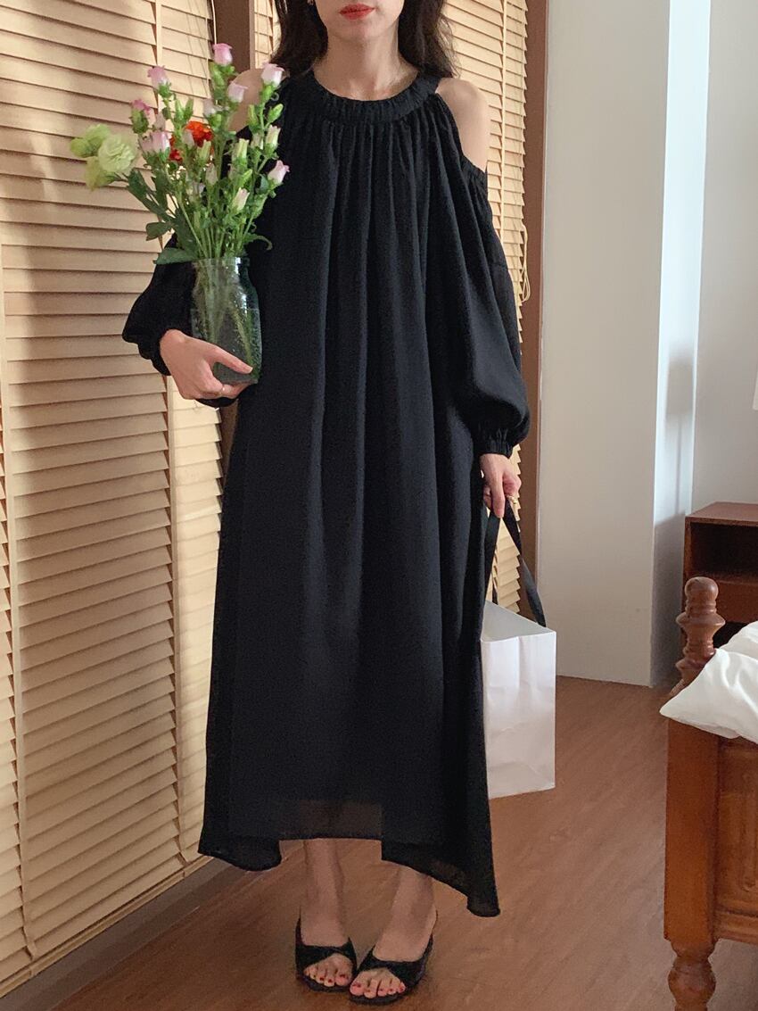 (4色選択可) ワンピース レディース ロング丈 長袖 ラウンドネック 長袖 シフォン 透け感 シアー オープンショルダー ギャザー ホルターネック ボディコンシャ シンプル カジュアル シック 大人 エレガント きれいめ おしゃれ こなれ感 大人女子 大人カジュアル 大人可愛い お洒落 かわいい ガーリー フリーサイズ 10代 20代 30代 40代 普段使い デイリー 休日 お出かけ デート 女子会 モテ コーデ スタイル 韓国系 ファッション 無地 | Chère