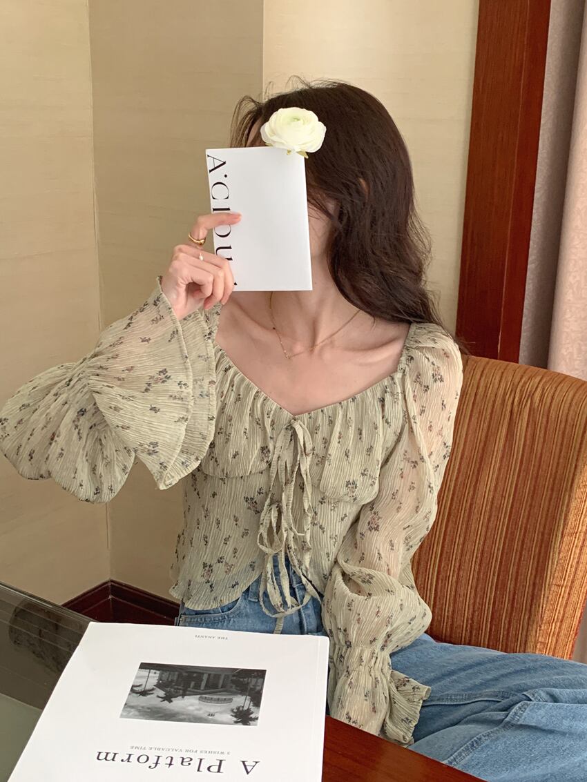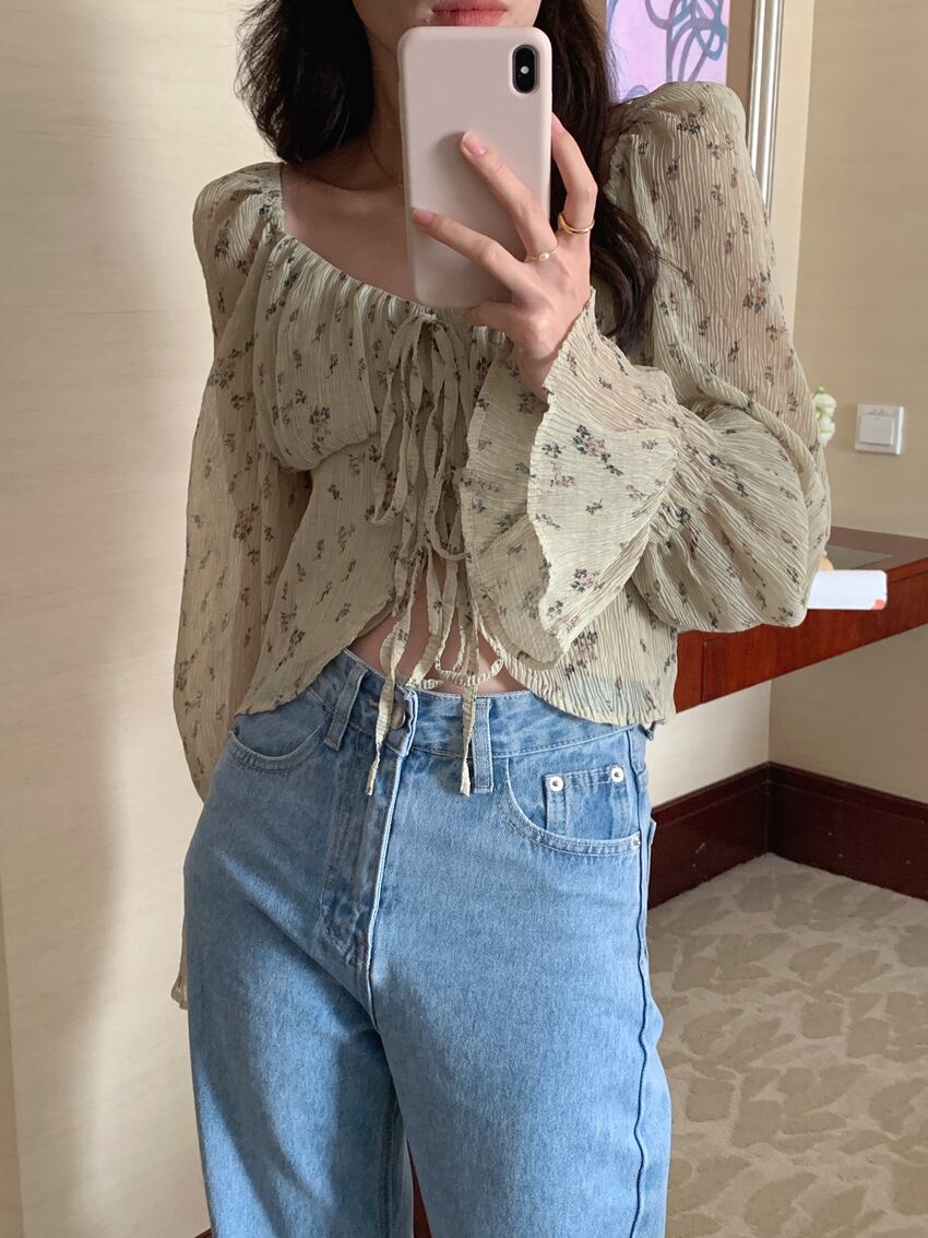 トップス シャツ ブラウス シフォンブラウス 花柄 フラワー ショート丈 へそ出し 透け感 ワッシャー加工 リボン ギャザー スクエアネック Vネック 長袖 キャンディースリーブ ゆったり レディース 可愛い きれいめ シンプル カジュアル 大人 かわいい おしゃれ お洒落 上品 フェミニン 大人可愛い 大人女子 春 夏 秋 10代 20代 30代 40代 デート お出かけ 女子会 デイリー リゾート 海 ビーチ 普段着 グリーン 緑色 | Chère