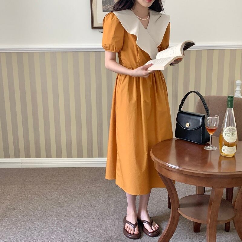 (3色選択可) ワンピース ロング ロング丈 半袖 バイカラー 襟付き フレアワンピース パフスリーブ 萌袖 Vネック フレア ハイウエスト かわいい 大人可愛い きれいめ シンプル 大人 上品 おしゃれ お洒落 レトロ 大人可愛い 大人女子 こなれ感 ラフ ラブリー キュート ガーリー 個性的 フリーサイズ ゆったり ゆる 黒 ブラック 黄色 オレンジ くすみカラー 大人カラー 春カラー 無地 春 夏 10代 20代 30代 40代 レディース オフィス OL 通勤 デート お出かけ 女子会 パーティー