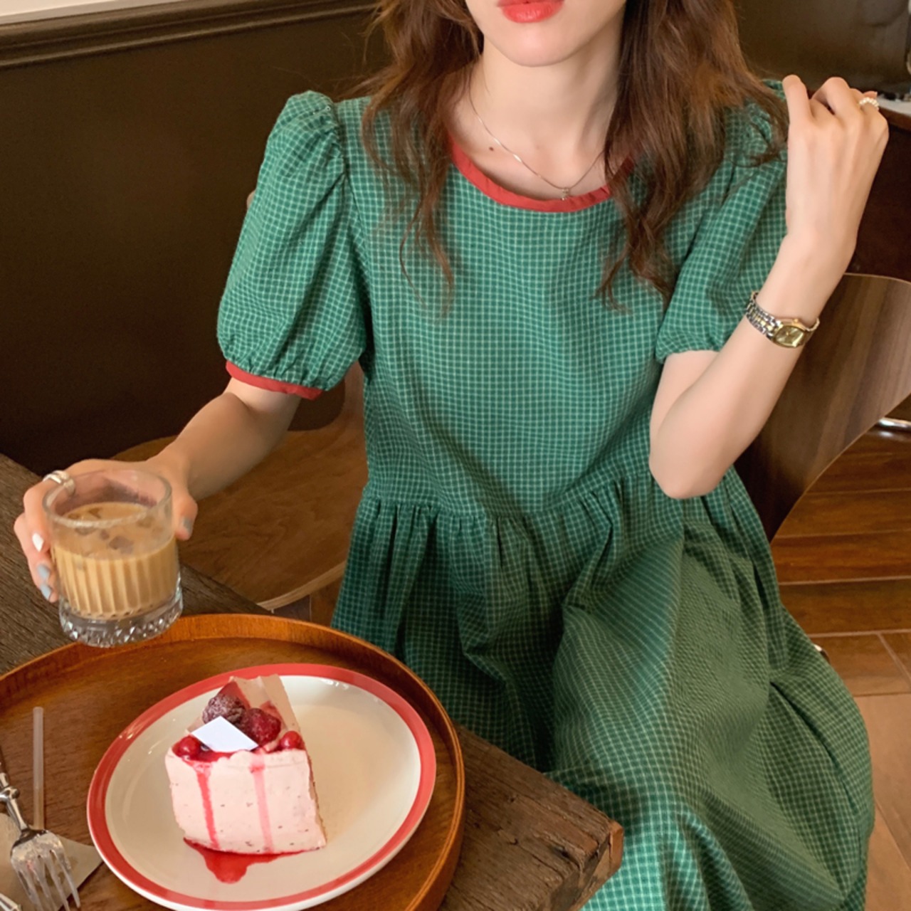 (2色選択可) ワンピース レディース Aライン ティアード チェック パイピング バイカラー フレア バルーンスリーブ ハイウエスト ミモレ丈 膝下 ラウンドネック 半袖 ゆったり レディース 可愛い きれいめ シンプル カジュアル 大人 かわいい おしゃれ お洒落 上品 フェミニン 大人可愛い 大人女子 春 夏 10代 20代 30代 40代 デート お出かけ 女子会 デイリー 普段着 レッド グリーン