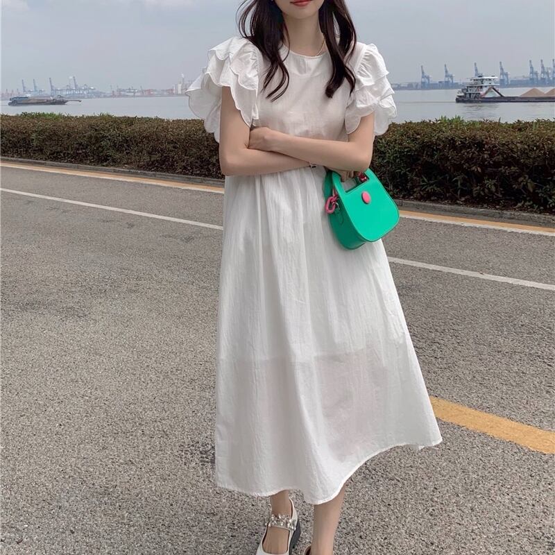 花びらのような二段フリル袖が存在感抜群なミモレ丈ワンピースです。