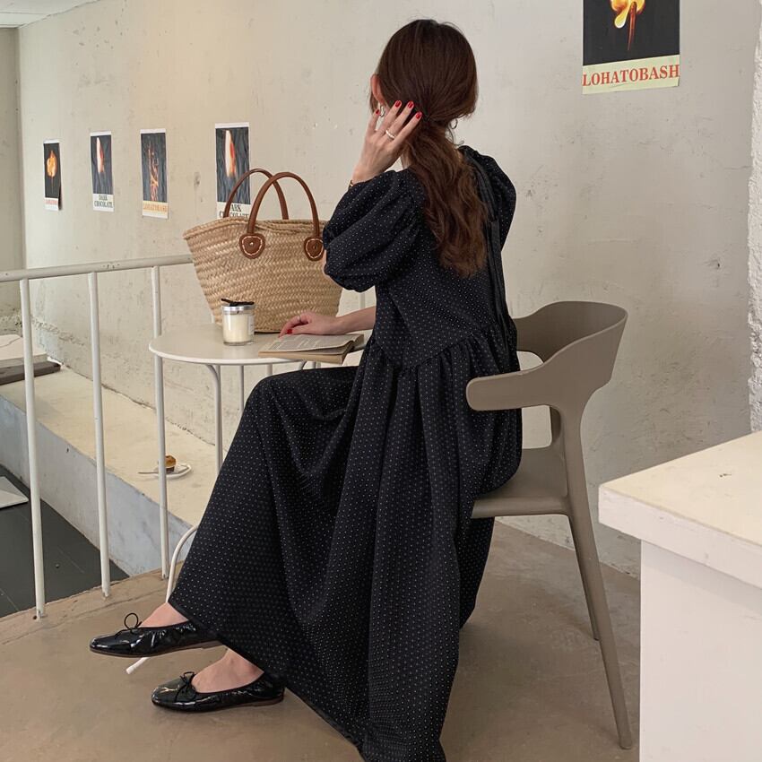 繊細なドット模様のパンチングレースとバイカラーパイピングでレトロガーリーなワンピースです。