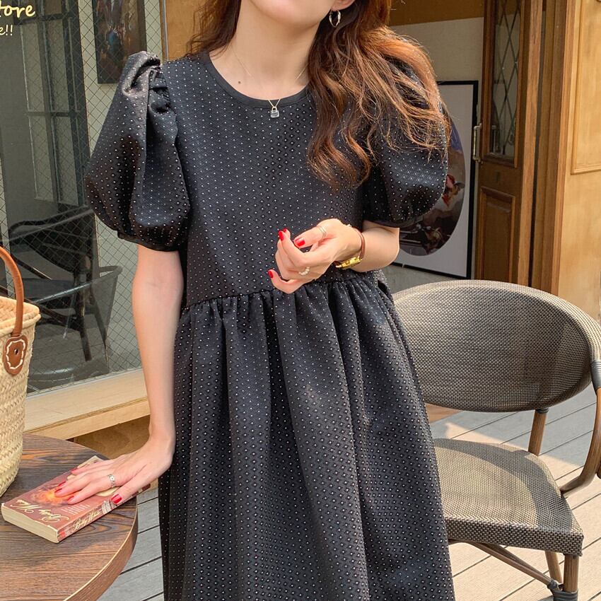 (2色選択可) ワンピース レディース Aライン フレア パイピング ドット パンチングレース バイカラー フレア バルーンスリーブ ハイウエスト ミモレ丈 膝下 ラウンドネック 半袖 ゆったり レディース 可愛い きれいめ シンプル カジュアル 大人 かわいい おしゃれ お洒落 上品 フェミニン 大人可愛い 大人女子 春 夏 10代 20代 30代 40代 デート お出かけ 女子会 デイリー 普段着 アプリコット ブラック | Chère