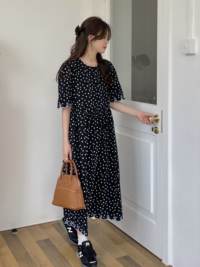 (2色選択可) ワンピース ドット柄 Aラインワンピース フレアワンピース ロングワンピース ロング丈 ミモレ丈 ギャザー スカラップ ラウンドネック 半袖 ゆったり レディース 可愛い きれいめ シンプル カジュアル 大人 かわいい おしゃれ お洒落 上品 フェミニン ガーリー 大人可愛い 大人女子 春 夏 10代 20代 30代 40代 デート お出かけ 女子会 デイリー 普段着 ブラック ベージュ 黒色