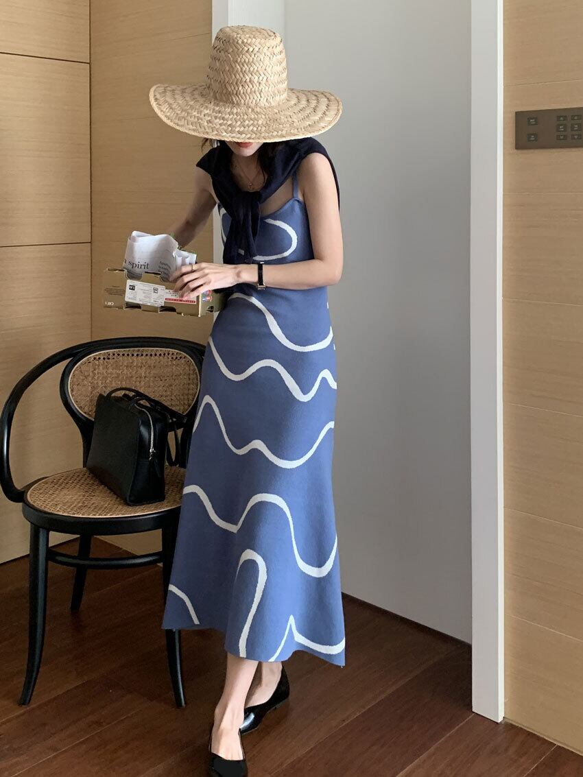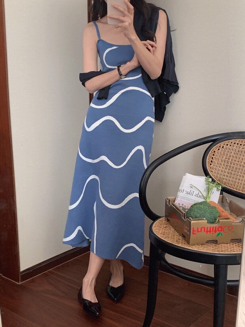 不規則なボーダー柄の大人可愛いニットキャミワンピース。