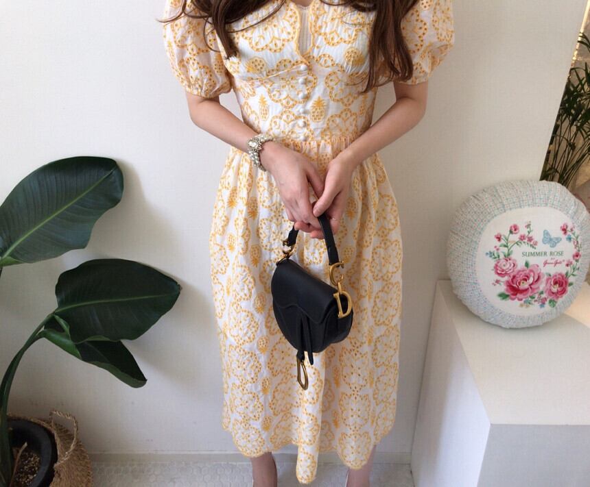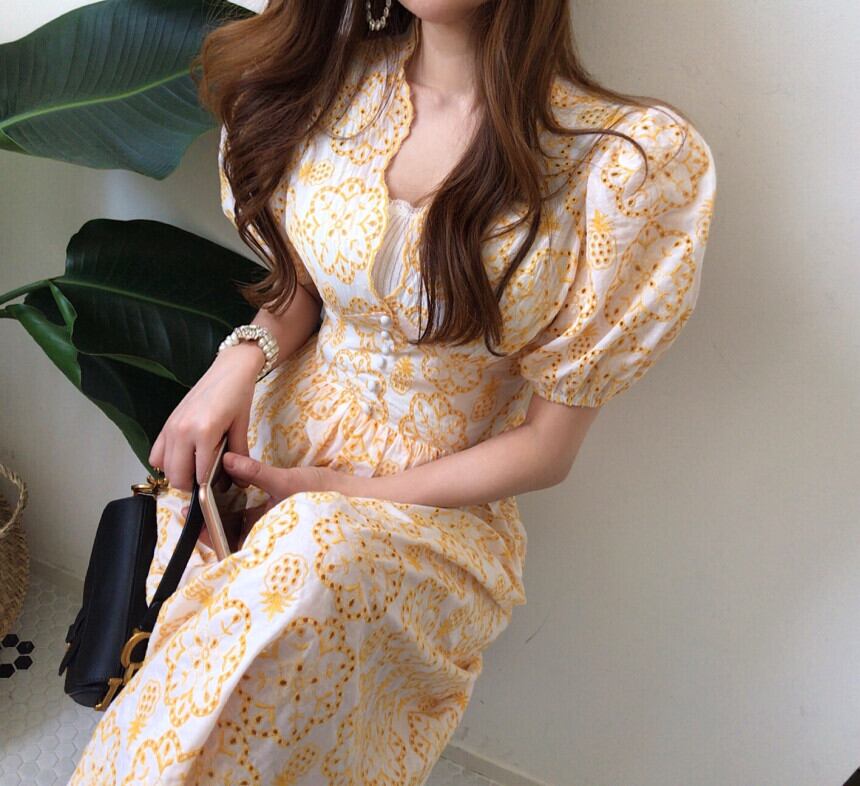 (サイズが選択可) ワンピース 花柄ワンピース フラワー 刺繍 スカラップ Aラインワンピース フレアワンピース ロングワンピース ロング丈 ミモレ丈 ギャザー 半袖 パフスリーブ ゆったり レディース 可愛い きれいめ シンプル カジュアル 大人 かわいい おしゃれ お洒落 上品 フェミニン ガーリー 大人可愛い 大人女子 春 夏 10代 20代 30代 40代 デート お出かけ 女子会 デイリー 普段着 イエロー 黄色 | Chère