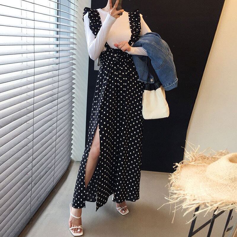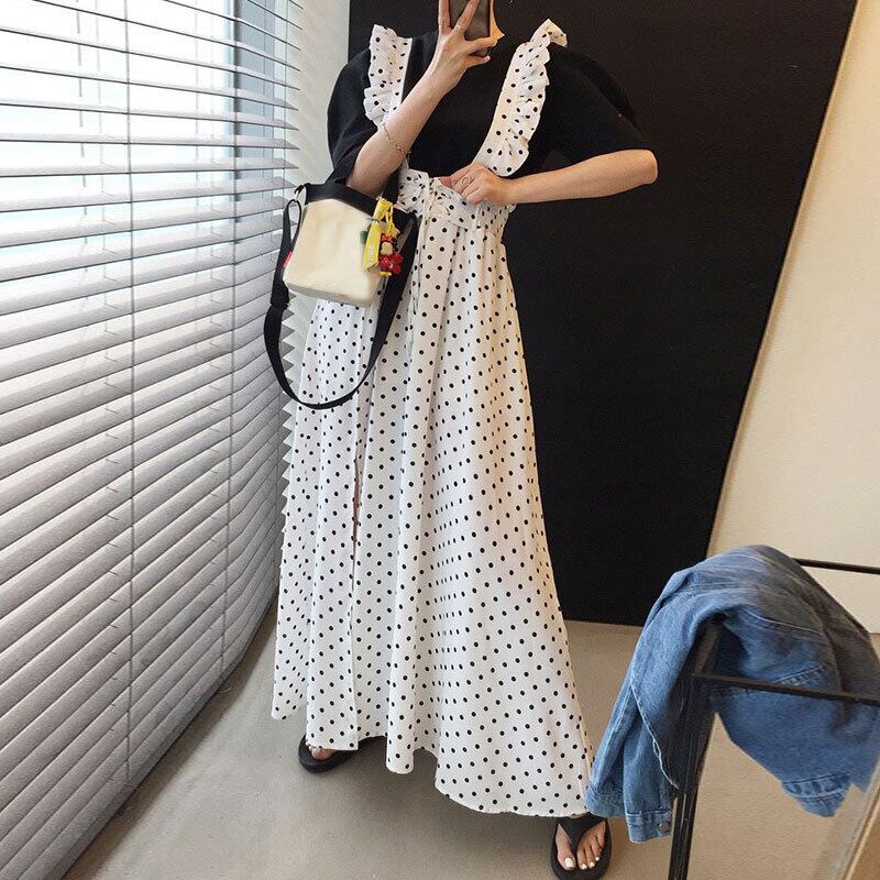 (2色選択可) ジャンパースカート サロペット ドット柄 フリル リボン スリット フレア ロングワンピース ロング丈 マキシ丈 レディース 可愛い きれいめ シンプル カジュアル 大人 かわいい おしゃれ お洒落 上品 フェミニン ガーリー 大人可愛い 大人女子 春 夏 10代 20代 30代 40代 デート お出かけ 女子会 デイリー 普段着 ホワイト ブラック 黒色 白色 | Chère