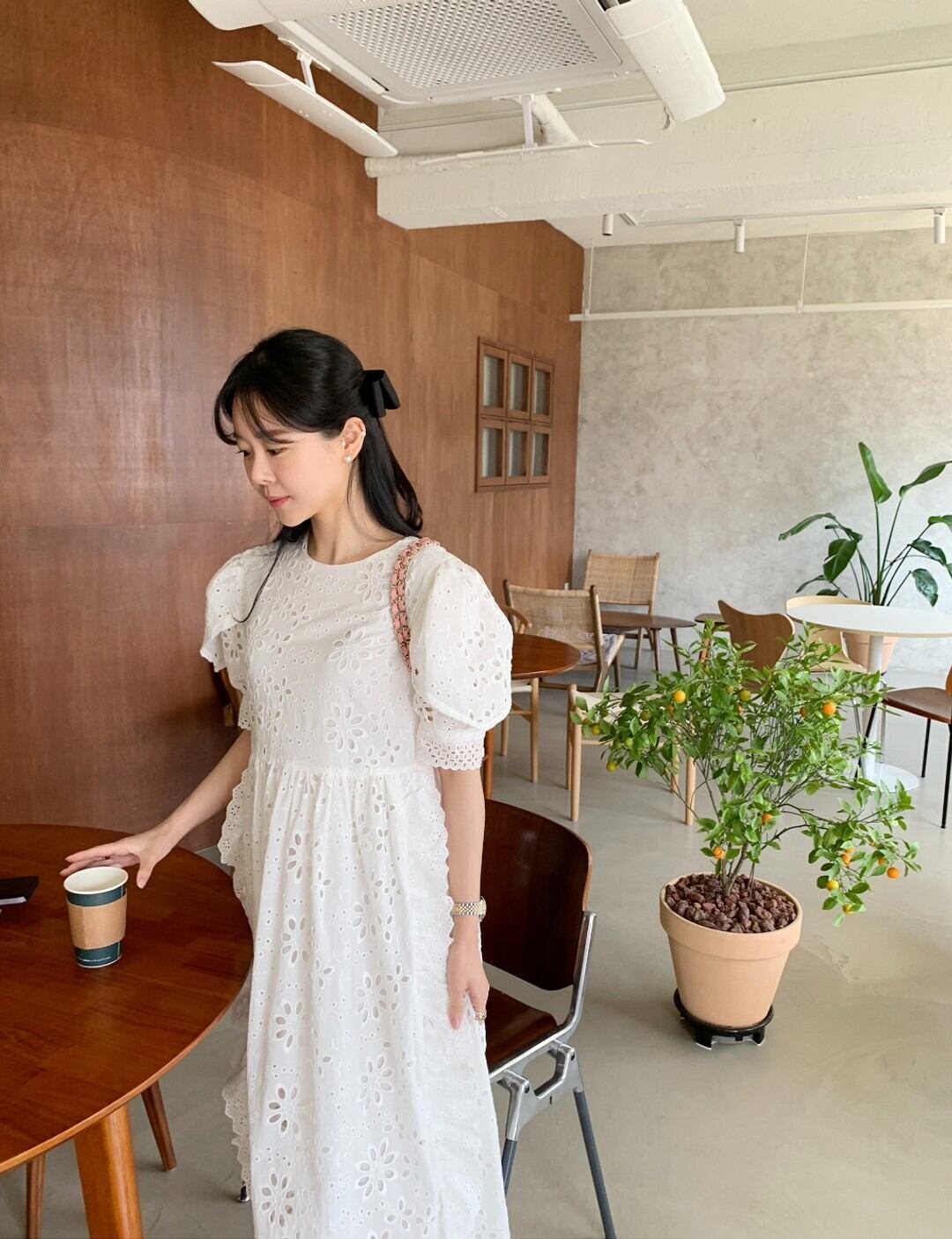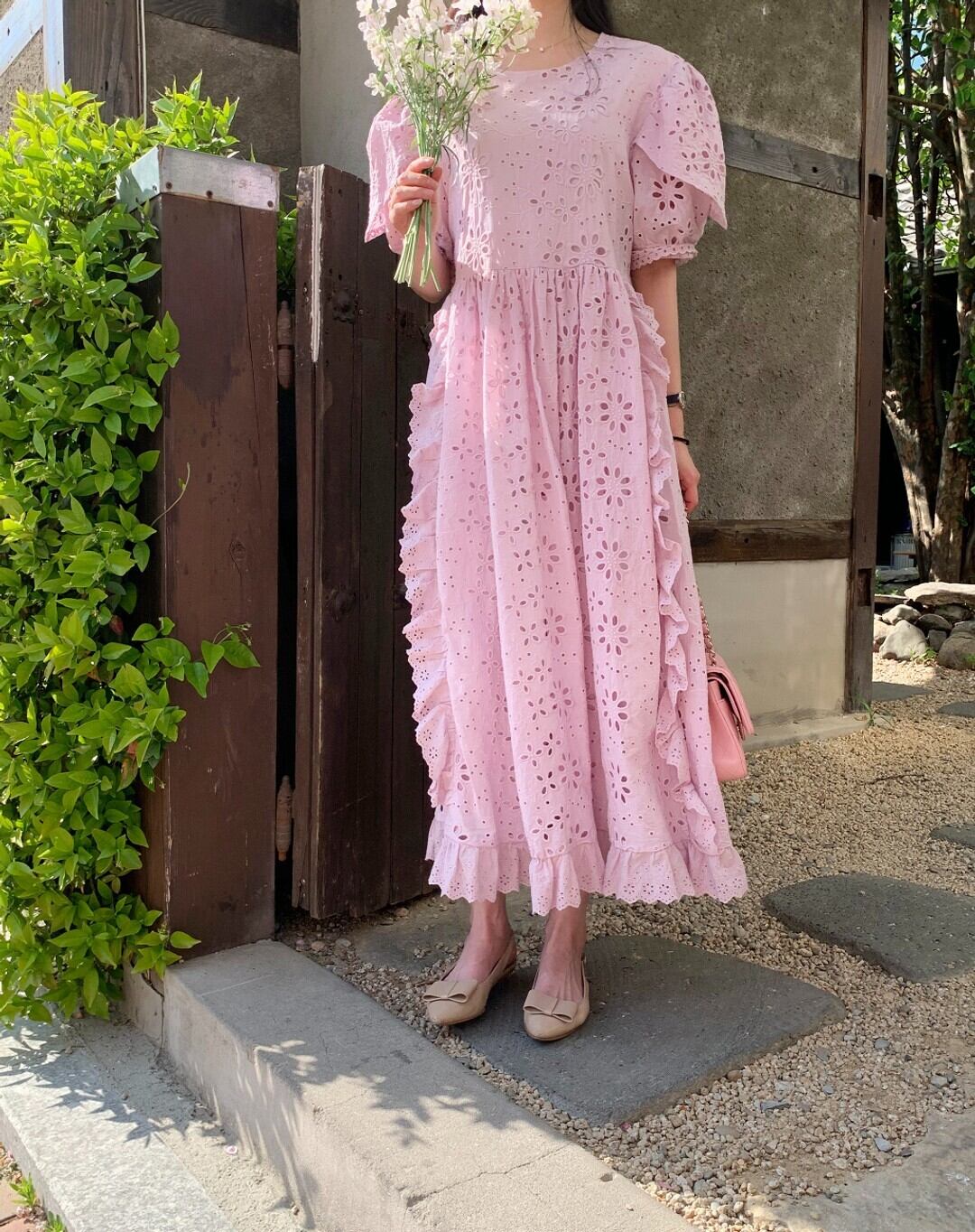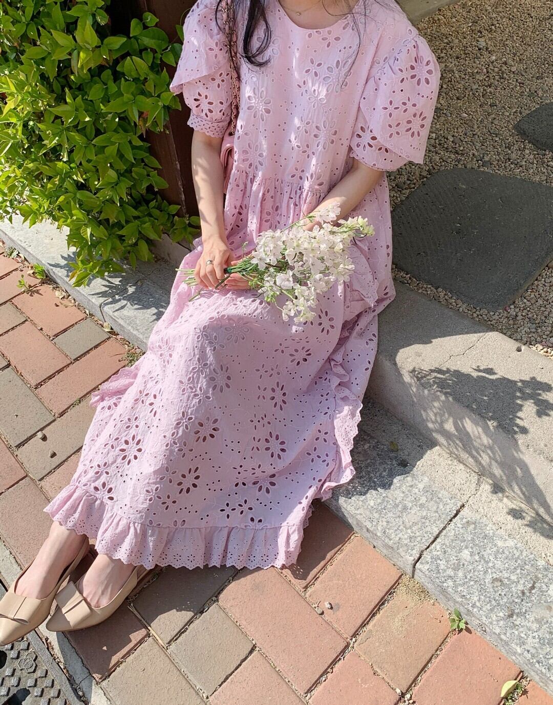 (2色選択可) ワンピース レースワンピース フリル 透かし彫り Aラインワンピース フレアワンピース ロングワンピース ロング丈 マキシ丈 ギャザー ラウンドネック 半袖 パフスリーブ 無地 レディース 可愛い きれいめ シンプル カジュアル 大人 かわいい おしゃれ お洒落 上品 フェミニン ガーリー 大人可愛い 大人女子 春 夏 10代 20代 30代 40代 デート お出かけ 女子会 デイリー 普段着 パープル ホワイト 紫色 白色 | Chère