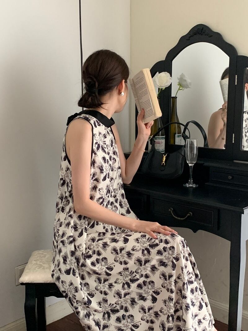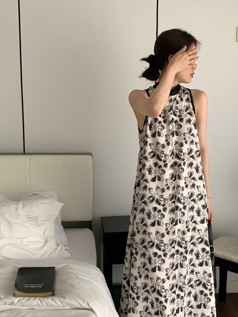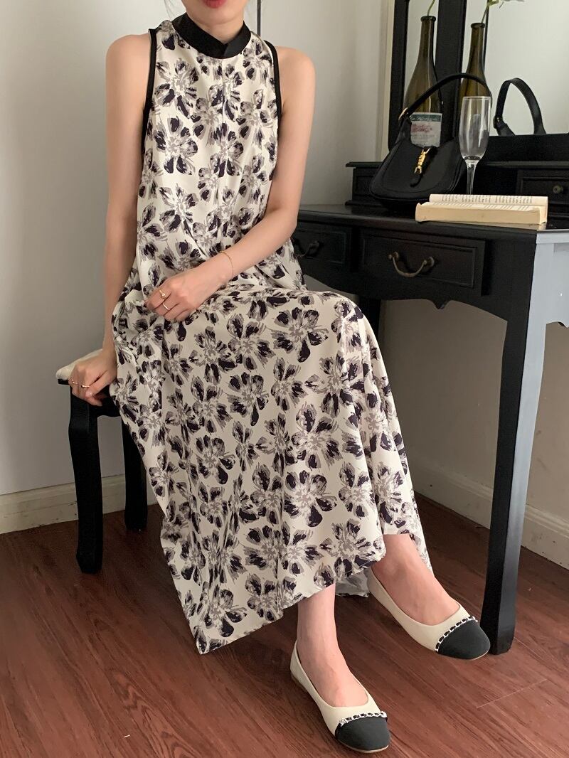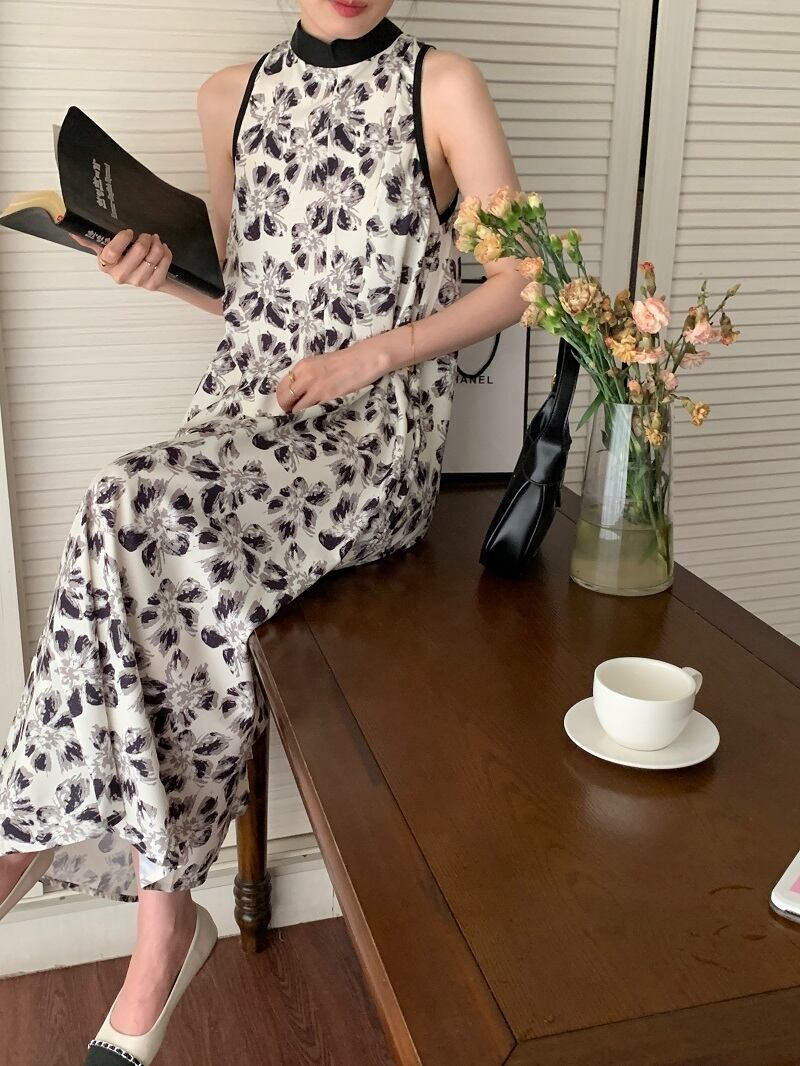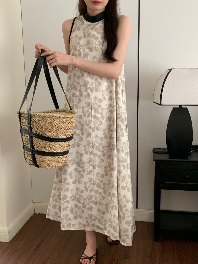 (2色選択可) ワンピース ロングワンピース ホルターネック ロング丈 ノースリーブ スタンドカラー ハイウエスト レディース 大人女子 レトロ 大人 かわいい カジュアル 個性的 おしゃれ 可愛い お洒落 大人可愛い こなれ感 ワンサイズ フリーサイズ 10代 20代 30代 40代 普段着 デート お出かけ 女子会 インスタ映え 韓国系 ファッション 花柄 ブラック 黒 カーキ | Chère